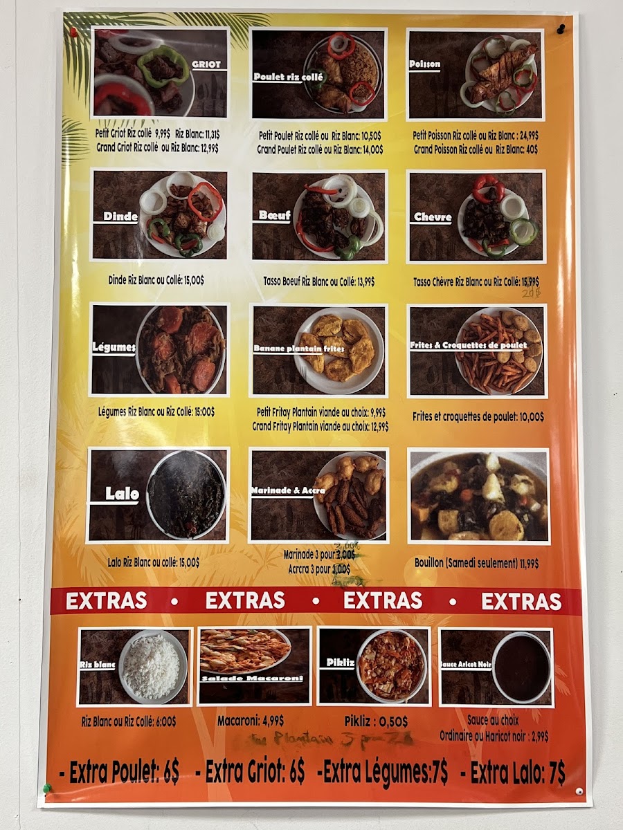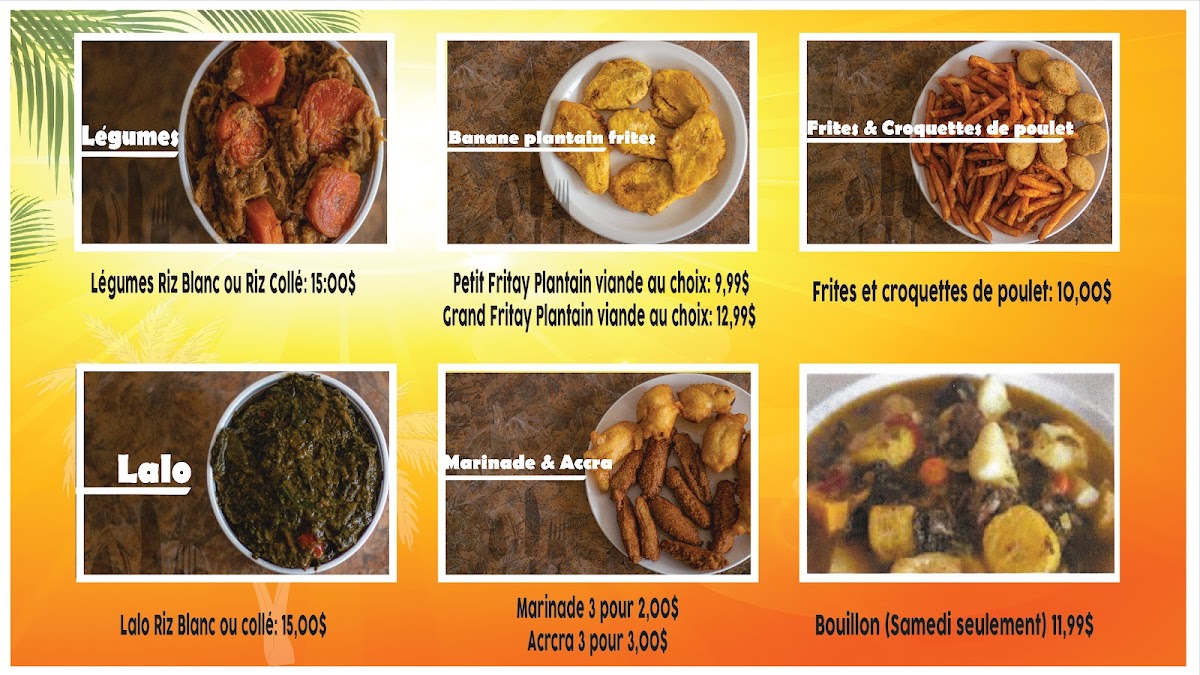 The menu at MARCHÉ CASSE-CROUTE CRÉOLE is a celebration of traditional Haitian cuisine. You'll definitely want to try their signature dishes, including the Légumes served with Riz Blanc or Riz Collé for only CA$15.00, a hearty and flavorful option that showcases the vibrant veggies typical of island cooking. Don’t miss the Griyo served with rice, a fan favorite perfect for those seeking tender fried pork that melts in your mouth. If you're feeling adventurous, indulge in their delicious Marinade & Accra with a delightful trio of marinades at just CA$2.00 or savor the crispy Accra for CA$5.00.